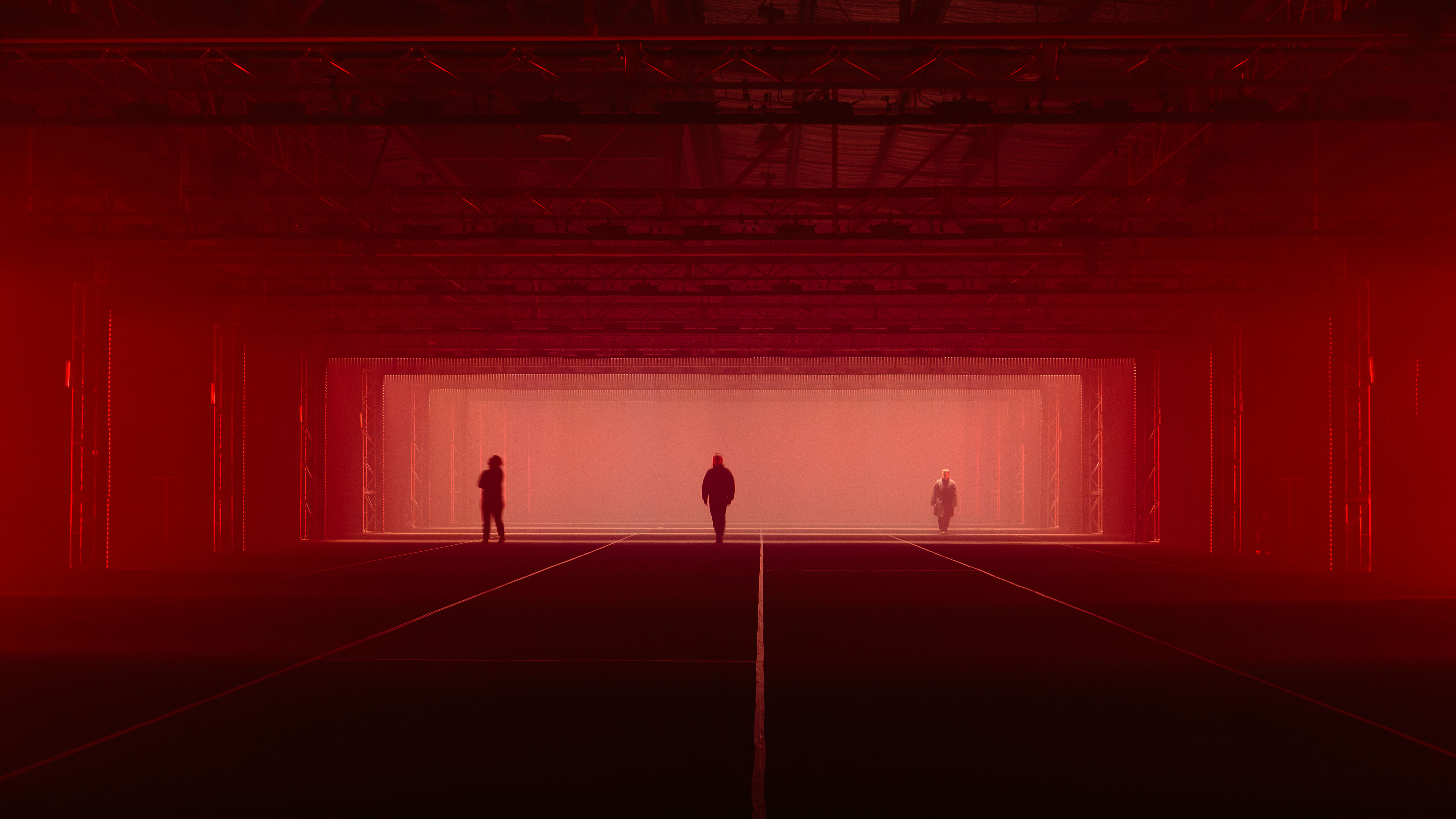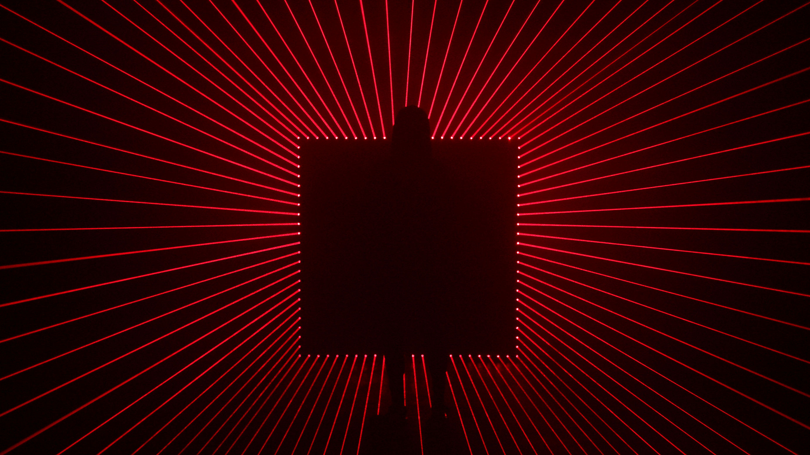 Eight laser projectors are driven by random algorithms and the sound is generated with modular synthesizers in real time.